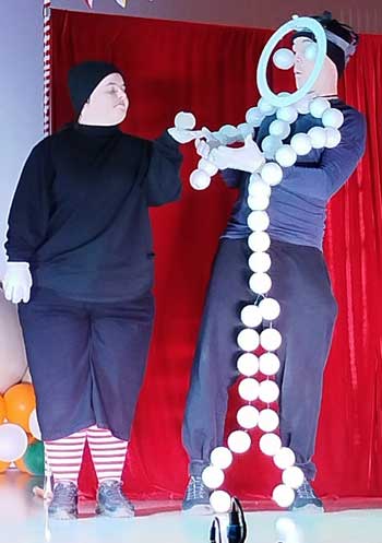 Свет погас, и необычная музыка пригласила зрителей к театральному действию. Из-за занавеса начали появляться шары, большие и маленькие. Дальше возникли удивительные звуки и голоса. И вот появились ребята, участники театра. Жители волшебной страны или гномы? Длинные полосатые носки, черная одежда и шапочки – сам актер как будто невидим для зрителя. Видишь только лица актеров и мячи в их руках, большие и маленькие. И начинается необыкновенное путешествие, каждому здесь отведено свое место. Движение по сцене с мячами и шарами в разном настроении, в разном темпе и ритме. Каждый рассказывает зрителям свою историю… Увлеченно, мастерски, вдохновенно…