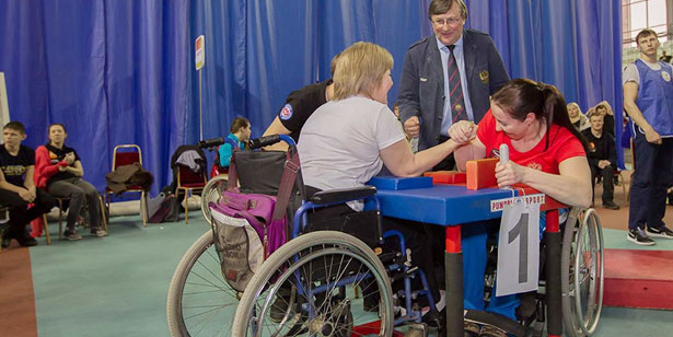 Состязания по армрестлингу судит Сергей Вяткин. Среди лучших участников — чемпион России этого года Алексей Казанцев, спортсмен с ДЦП, Дмитрий Окулов, с ампутацией одной руки — тоже чемпион России этого года. Оба из Соликамска.